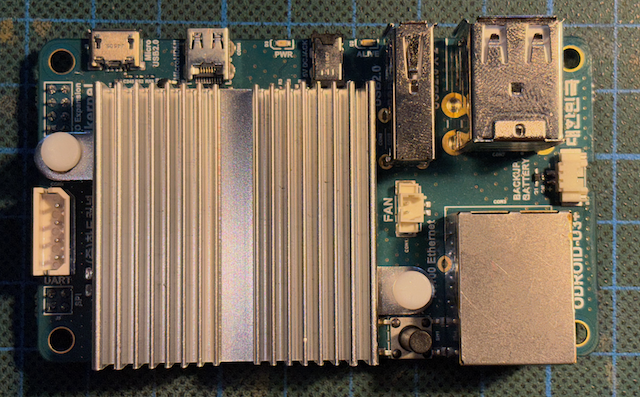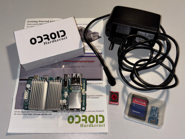 - Der eMMC-Speicher ist schnell, aber bootet nur unzuverlässig. (Ich bezichtige die winzigen Steckerchen des eMMC-Moduls, siehe Fotos!) Ich habe daher eine 128GB SD-Karte von Samsung probiert. Von dieser booted der Odroid erstaunlich schnell und zuverlässing. Trotzdem lege ich das eMMC-Modul inkl. SD-Adapter bei